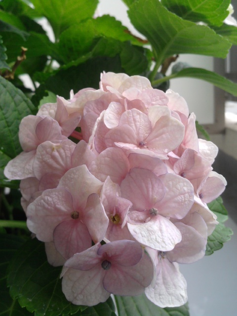 ベランダのアジサイの花が緑色になってきた。それはそれで綺麗なのだけど、白からピンクや薄紫になる頃が一番綺麗に思えた。